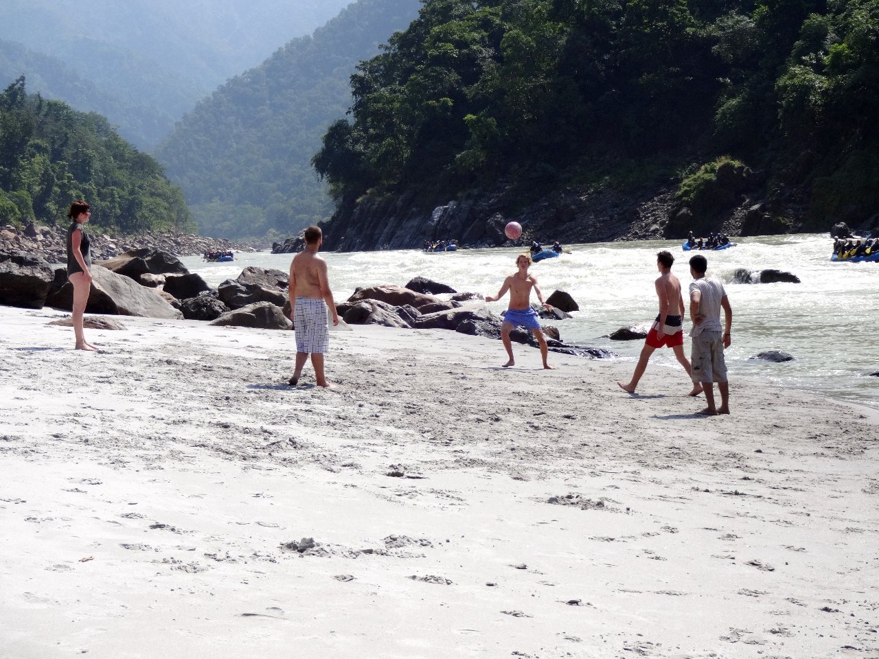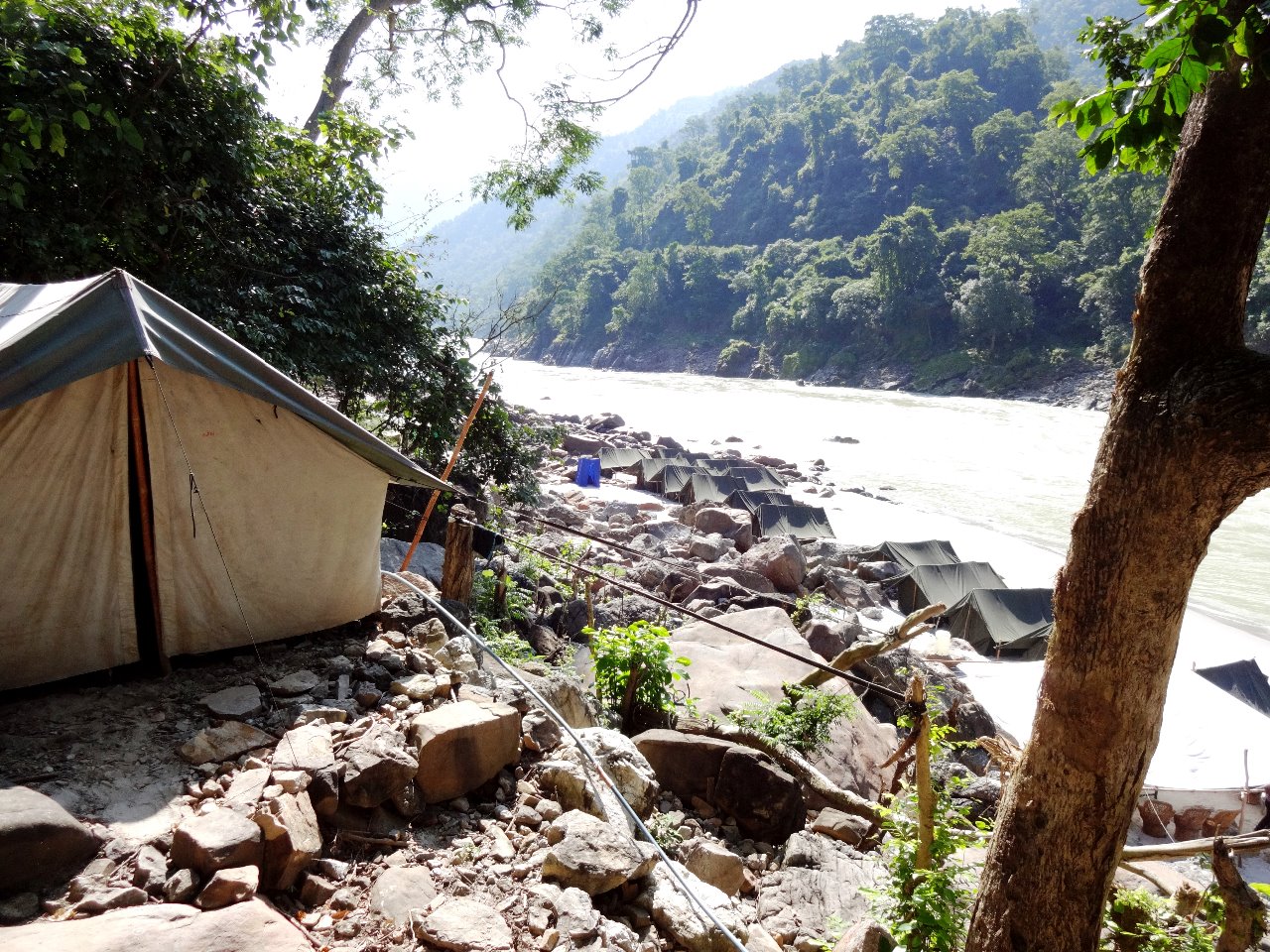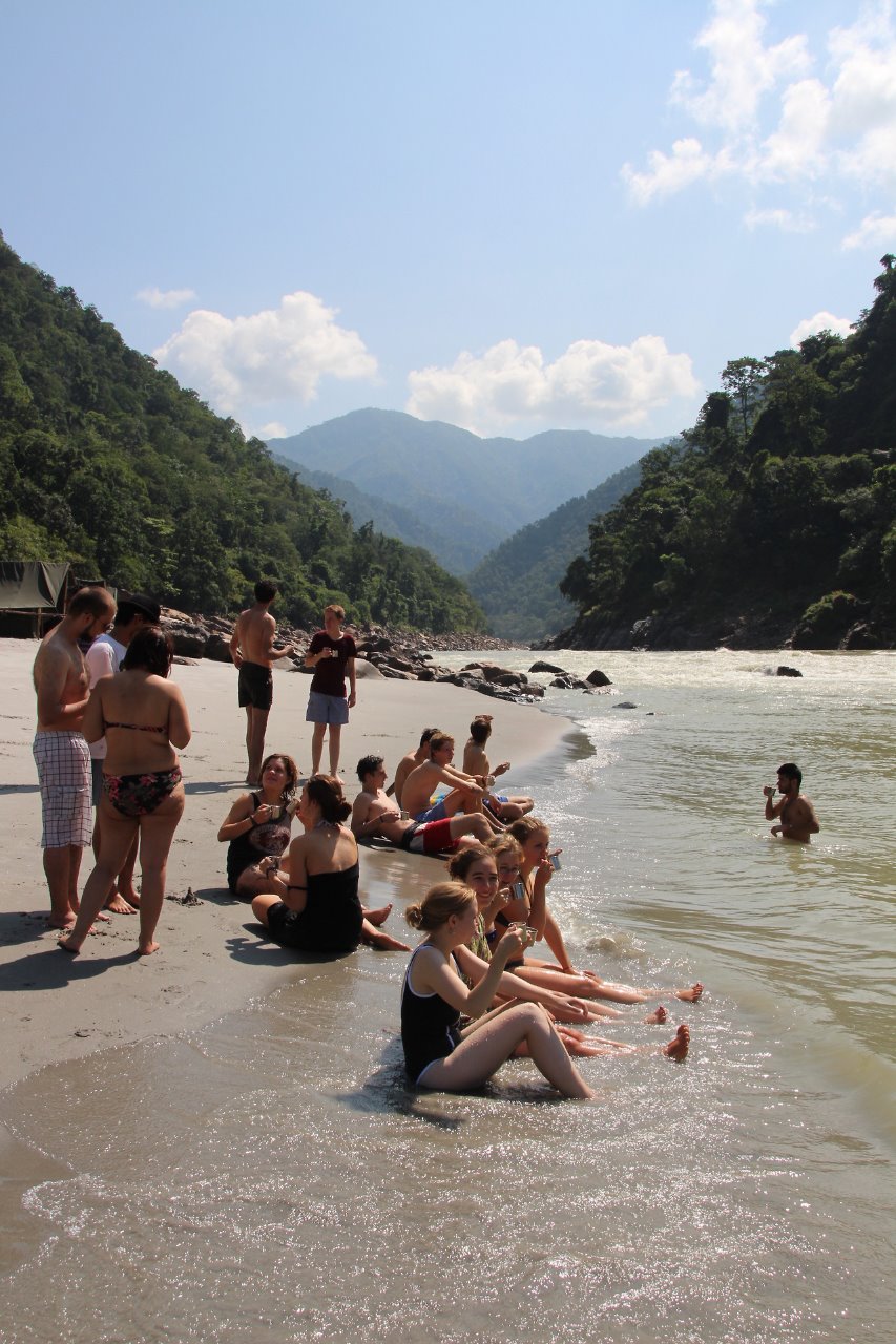 Zuerst stand uns eine sechs-stündige Fahrt mit 14 Personen in einem 10er Bus über holprige Landstraßen, durch Städte und über Land bevor. Völlig geschlaucht und müde wurden wir dann mitten auf einer Straße am Himalaya aus dem Bus geschmissen und wussten nicht wohin mit uns, bis unser Reiseleiter uns einen kleinen Weg durch den Wald zeigte, der steil nach unten bis an unser Ziel, das Camp Dream Live, führte. Mit den ersten Blicken verschwand alle Müdigkeit: Ein sauberer Ganges, mit Sandstrand und kleinen Zelten mit "Meer"-Blick auf den Ganges, mitten im Himalaya! Nach dem ersten Rumgeplantsche im GANGES wurde uns Chai ins Wasser serviert und eine Shisha an den Strand gestellt. So lässt es sich wohl leben!