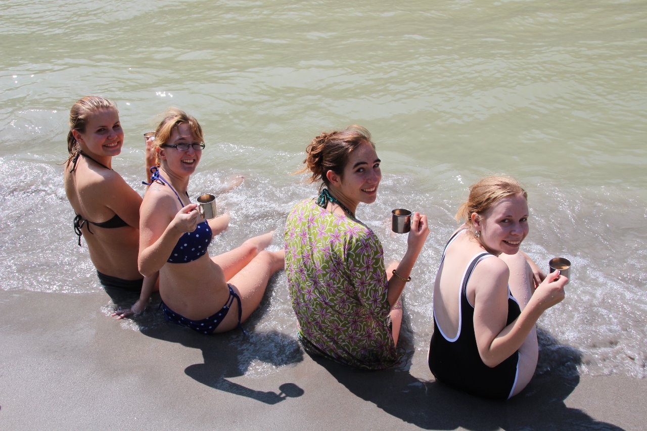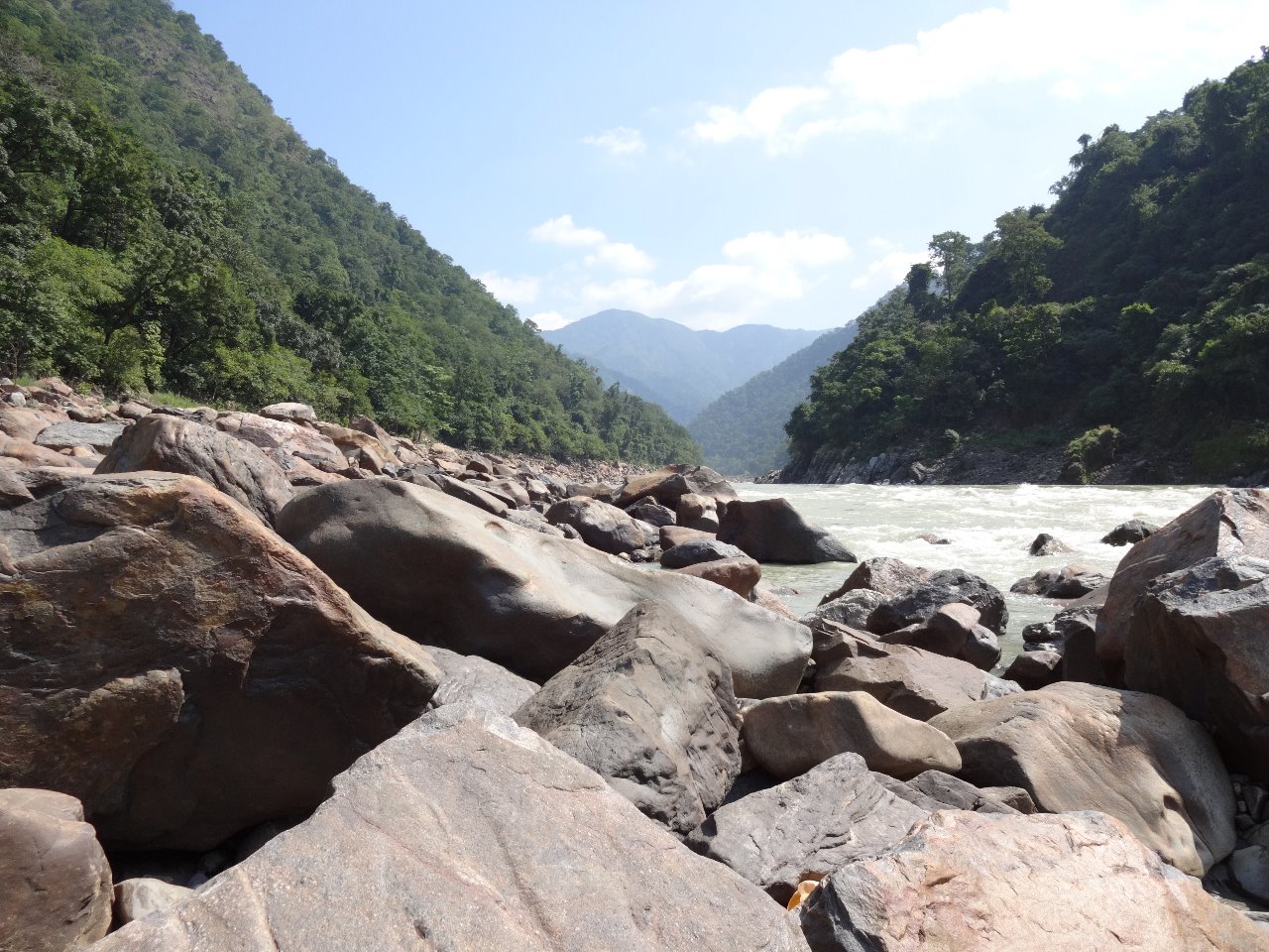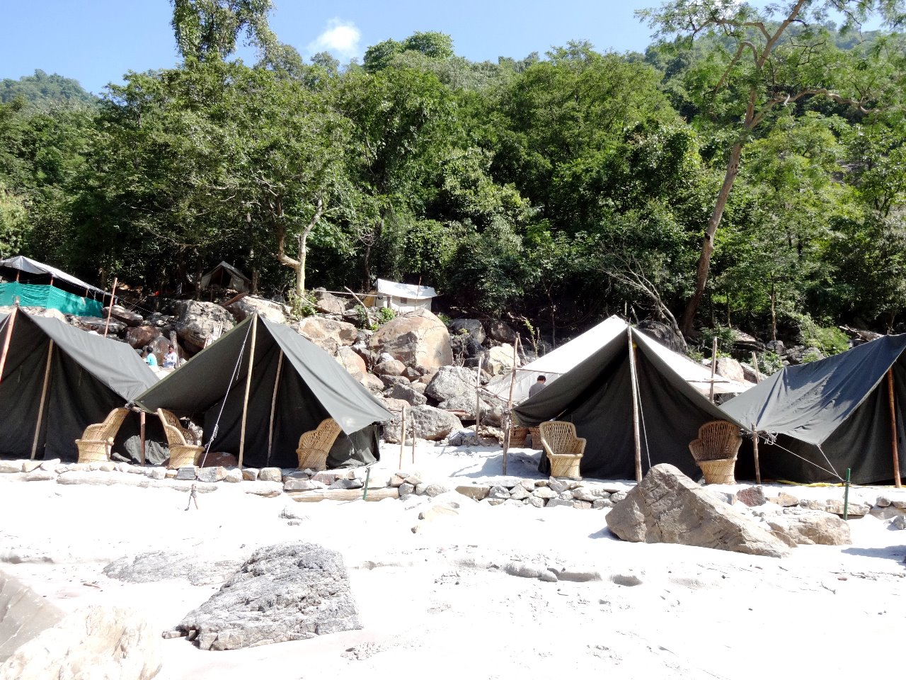 Zuerst stand uns eine sechs-stündige Fahrt mit 14 Personen in einem 10er Bus über holprige Landstraßen, durch Städte und über Land bevor. Völlig geschlaucht und müde wurden wir dann mitten auf einer Straße am Himalaya aus dem Bus geschmissen und wussten nicht wohin mit uns, bis unser Reiseleiter uns einen kleinen Weg durch den Wald zeigte, der steil nach unten bis an unser Ziel, das Camp Dream Live, führte. Mit den ersten Blicken verschwand alle Müdigkeit: Ein sauberer Ganges, mit Sandstrand und kleinen Zelten mit "Meer"-Blick auf den Ganges, mitten im Himalaya! Nach dem ersten Rumgeplantsche im GANGES wurde uns Chai ins Wasser serviert und eine Shisha an den Strand gestellt. So lässt es sich wohl leben!